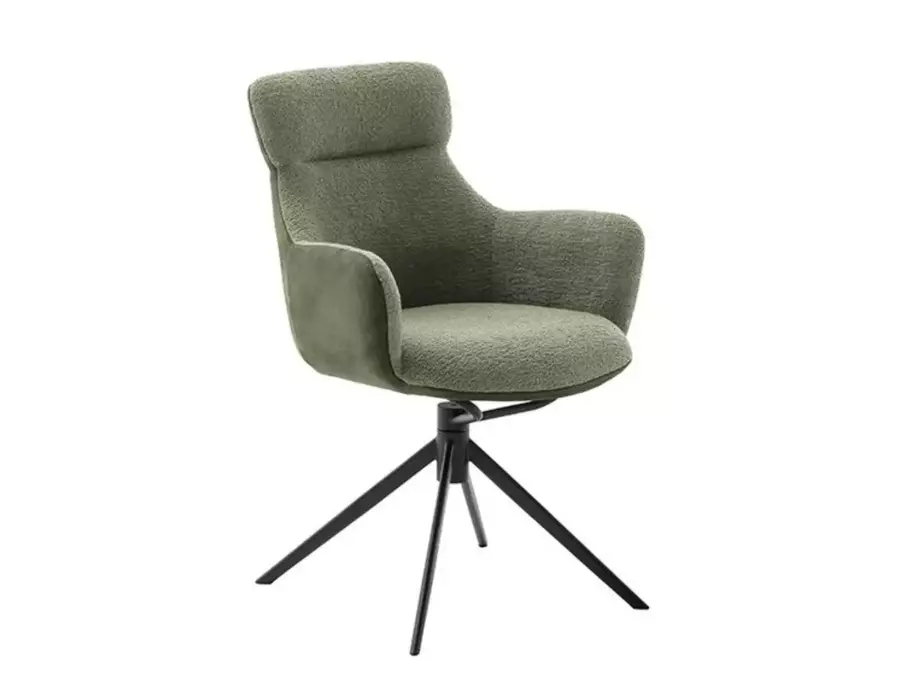 Вътрешната част на облегалката и седалката е тапицирана с елегантно букле, което придава текстурен и уютен вид, докато външната част е покрита с висококачествена алкантара – мек и издръжлив материал, който съчетава лукс и практичност. Алкантара е известна със своето приятно на допир усещане и лесно почистване, което добавя допълнителна стойност на стола.