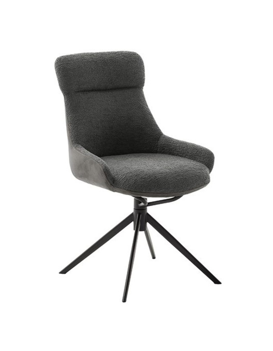 Вътрешната част на облегалката и седалката е тапицирана с елегантно букле, което придава текстурен и уютен вид, докато външната част е покрита с висококачествена алкантара – мек и издръжлив материал, който съчетава лукс и практичност. Алкантара е известна със своето приятно на допир усещане и лесно почистване, което добавя допълнителна стойност на стола.