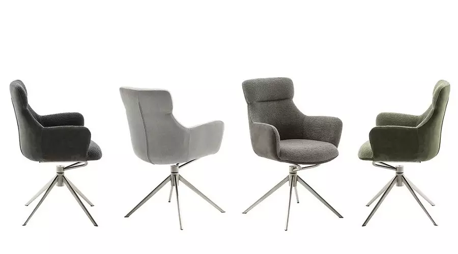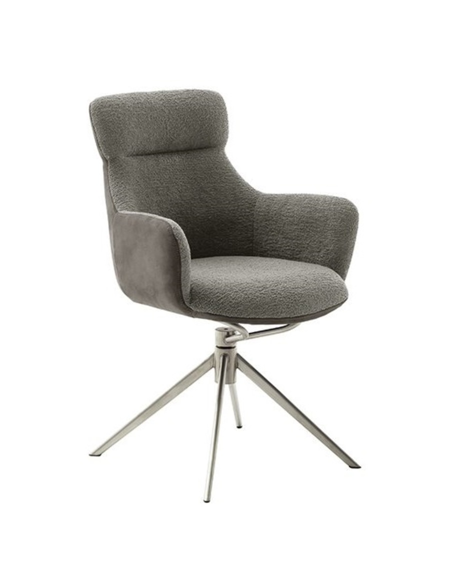 Вътрешната част на облегалката и седалката е тапицирана с елегантно букле, което придава текстурен и уютен вид, докато външната част е покрита с висококачествена алкантара – мек и издръжлив материал, който съчетава лукс и практичност. Алкантара е известна със своето приятно на допир усещане и лесно почистване, което добавя допълнителна стойност на стола.