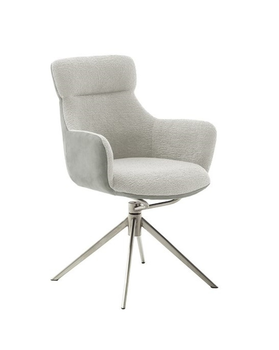 Вътрешната част на облегалката и седалката е тапицирана с елегантно букле, което придава текстурен и уютен вид, докато външната част е покрита с висококачествена алкантара – мек и издръжлив материал, който съчетава лукс и практичност. Алкантара е известна със своето приятно на допир усещане и лесно почистване, което добавя допълнителна стойност на стола.