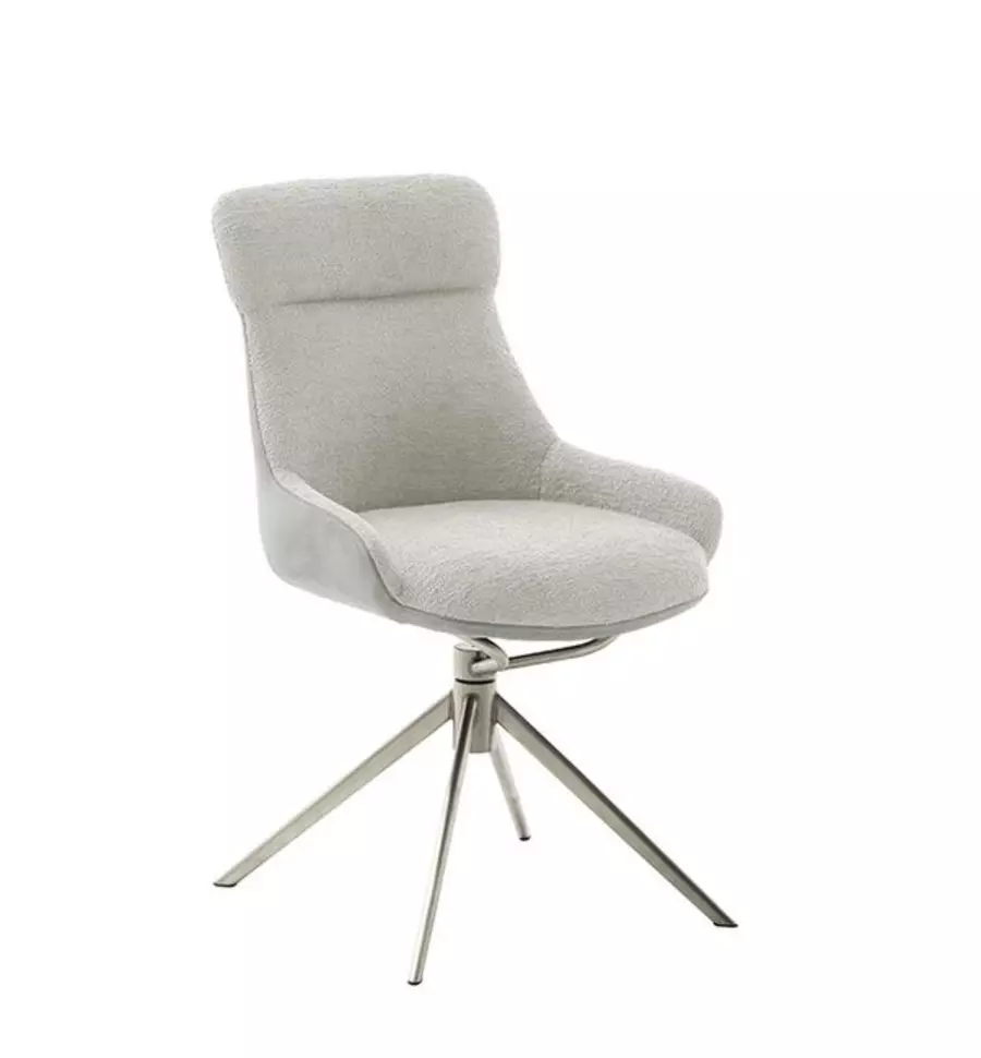 Вътрешната част на облегалката и седалката е тапицирана с елегантно букле, което придава текстурен и уютен вид, докато външната част е покрита с висококачествена алкантара – мек и издръжлив материал, който съчетава лукс и практичност. Алкантара е известна със своето приятно на допир усещане и лесно почистване, което добавя допълнителна стойност на стола.