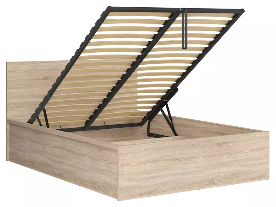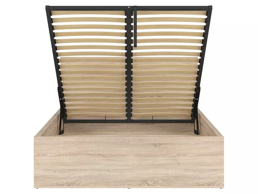 Леглото е оборудвано с повдигащ механизъм, който осигурява лесен достъп до обширно място за съхранение под матрака. Това пространство е подходящо за подреждане на спално бельо, възглавници и други вещи, спестявайки място и поддържайки ред в стаята. Конструкцията му е здрава и стабилна, изработена от висококачествени материали, гарантиращи дълготрайна издръжливост.