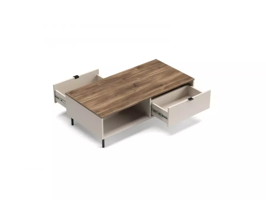 Моделът разполага с две чекмеджета, които предоставят удобство за съхранение на различни лични вещи, документи или други предмети, които искате да държите под ръка, но извън погледа. Чекмеджетата са снабдени с метални дръжки, които добавят допълнителен елегантен акцент към дизайна на масата.