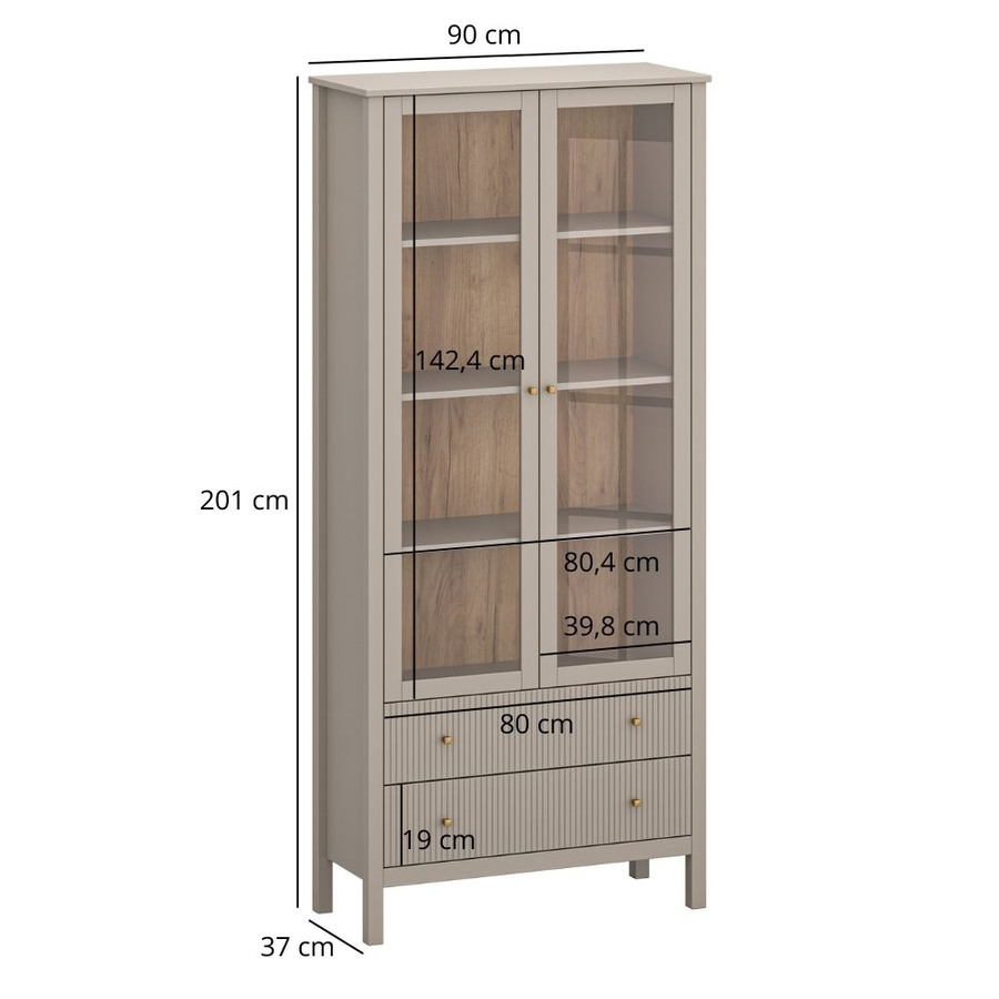 Витрина КЛЕО WIT_2W2S от колекция КЛЕО е елегантна и стилна мебел, съчетаващ висока функционалност и изчистен дизайн. Изработена е с корпус от ПДЧ и фронтове от МДФ, които осигуряват здравина и дълготрайност. Моделът разполага със стъклени витрини, идеални за експониране на декоративни предмети, книги или ценни вещи, създавайки визуален акцент в интериора. Стъклените рафтове добавят лекота и елегантност, придавайки модерна нотка на помещението.