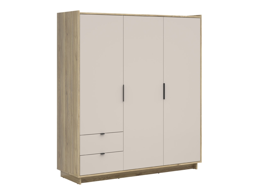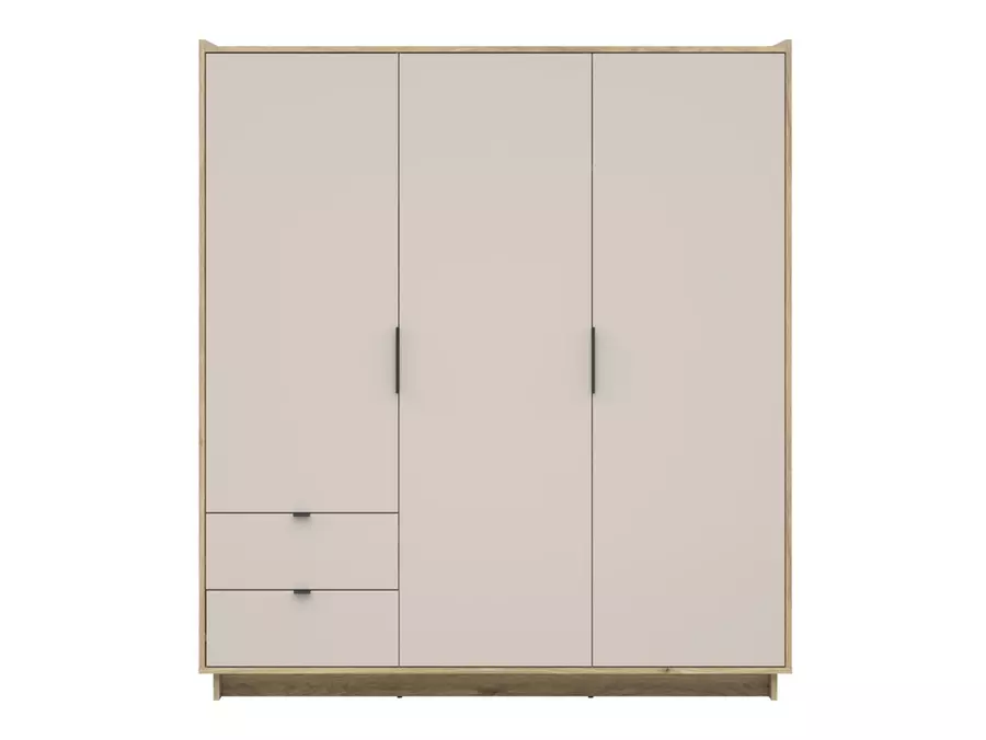 Трикрилният гардероб ДАЛВА SZF3D2S съчетава модерен дизайн и висока функционалност, осигурявайки достатъчно място за организиране на вашите дрехи и аксесоари. Изработен от 18 мм ПДЧ, той гарантира здравина и дълготрайност. Гардеробът разполага с три врати и две просторни чекмеджета, които предлагат практично съхранение на по-малки вещи и бельо.