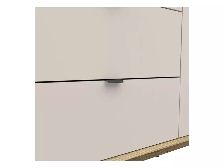 Вътрешното разпределение е изключително удобно – включва широк лост за закачалки, осигуряващ достатъчно място за висящи дрехи, както и просторни рафтове за сгънати дрехи, кутии или други вещи. Алуминиевите дръжки допринасят за елегантния и изчистен вид на гардероба, като същевременно са удобни за употреба.