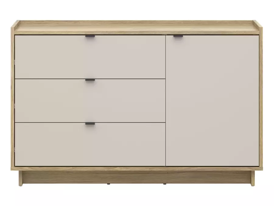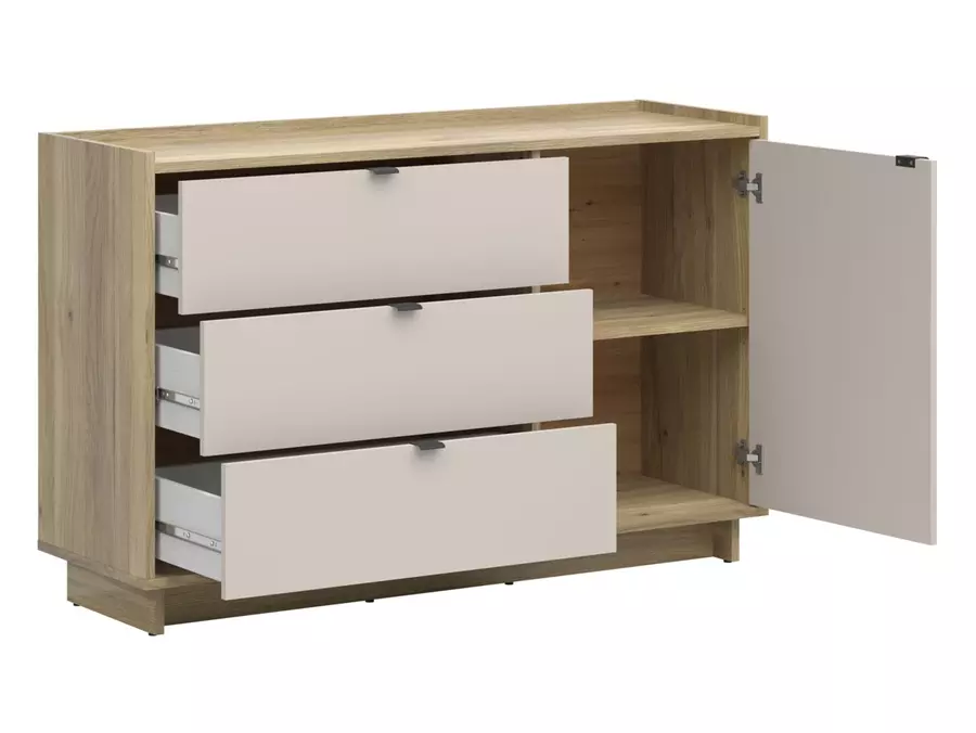 Разполага с три просторни чекмеджета, осигуряващи удобство за съхранение на дрехи, аксесоари и други вещи. Допълнително, вратичката с рафт предоставя още повече пространство за организация. Алуминиевите дръжки допълват изчистената и съвременна визия на модела, като същевременно гарантират удобство при отваряне и затваряне.
