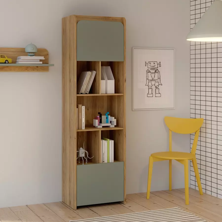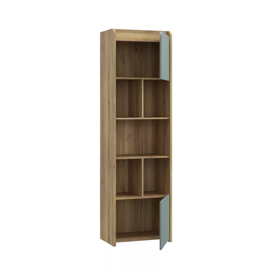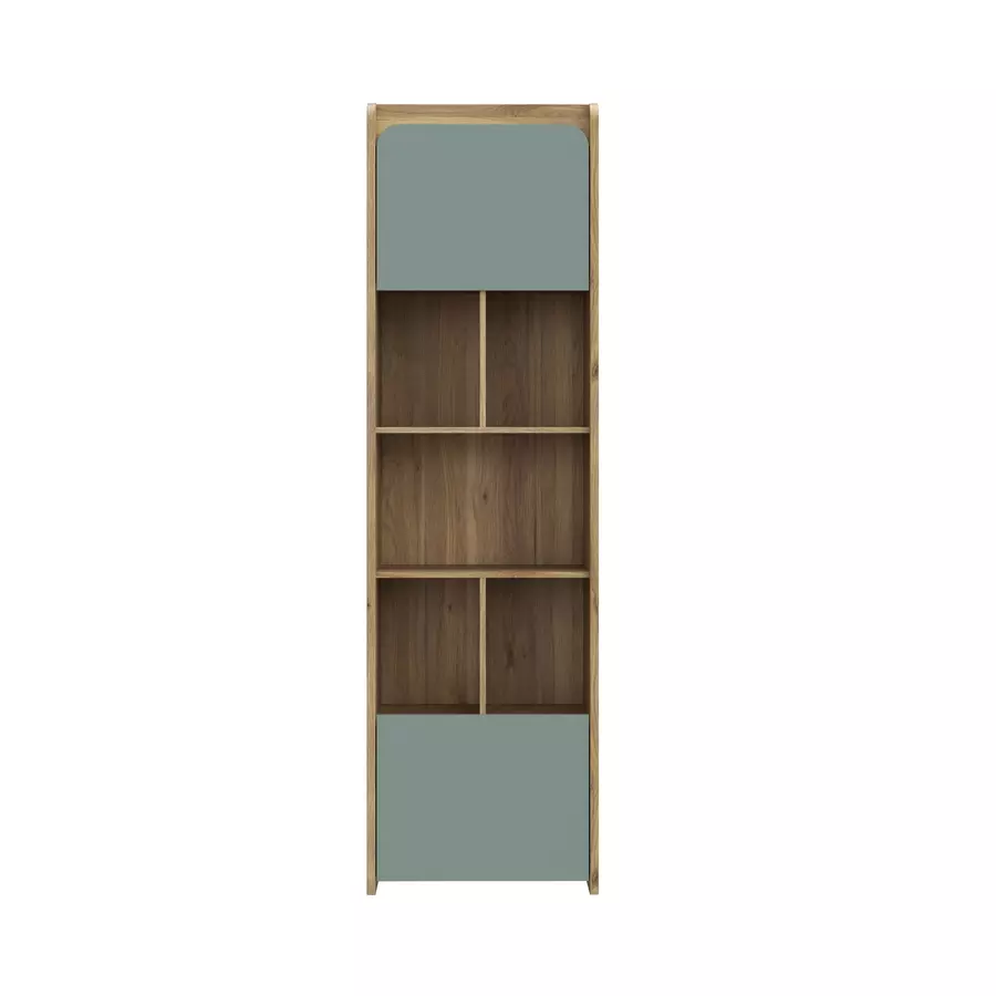Етажерката разполага с две вратички и отворени рафтове, които осигуряват разнообразие от възможности за организиране на различни вещи – от книги и декоративни елементи до канцеларски материали или други аксесоари. Вратите предлагат допълнително място за съхранение на предмети, които искате да скриете от погледа, докато отворените рафтове осигуряват бърз и лесен достъп до често използвани предмети.