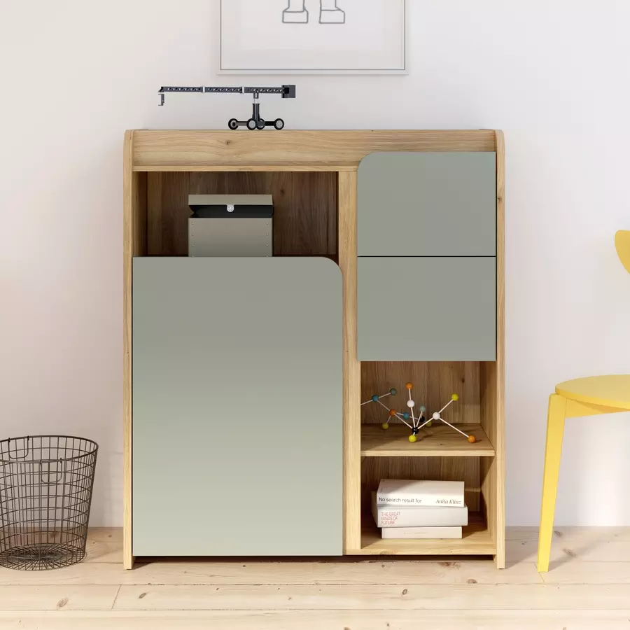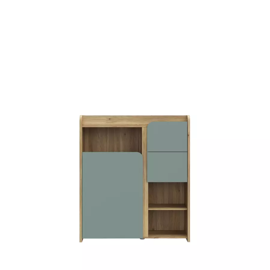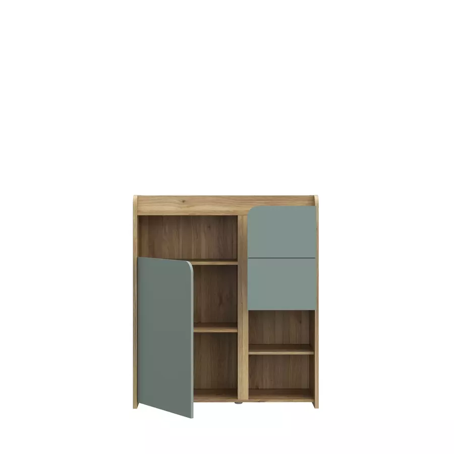 Скринът разполага с врата и две чекмеджета, предоставяйки както закрито, така и открито пространство за съхранение. Вратата позволява да се съхраняват предмети, които искате да скриете от погледа, а чекмеджетата предлагат удобен достъп до различни вещи като дрехи, аксесоари или документи.