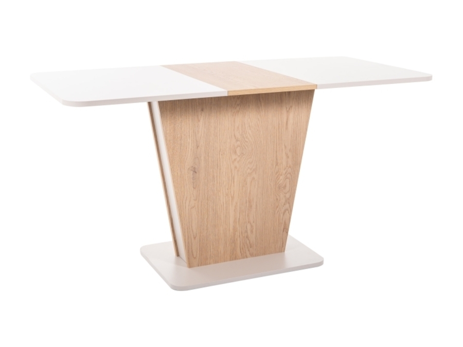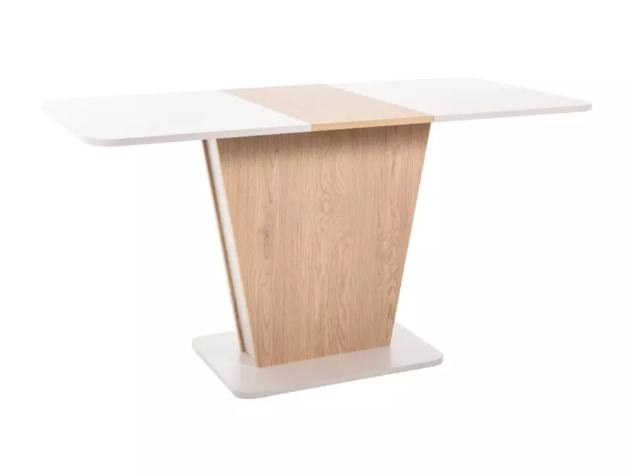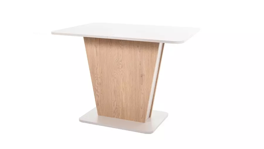Плотът е изработен от висококачествени материали, които гарантират дълготрайност и устойчивост на повреди. Разтегателният механизъм позволява увеличаване на дължината на плота до 145 см, осигурявайки достатъчно пространство за комфортно настаняване на повече хора. Това прави масата идеална както за ежедневна употреба, така и за специални поводи. Основата на масата е стабилна и здрава, изработена от модерни материали, които осигуряват сигурност и надеждност при употреба. Дизайнът на основата допринася за уникалния облик на масата, придавайки й модерен и изчистен стил.