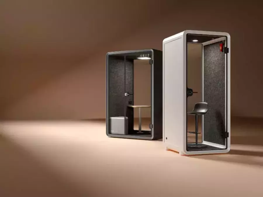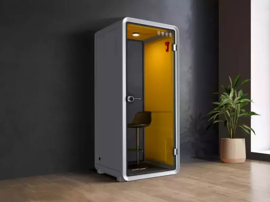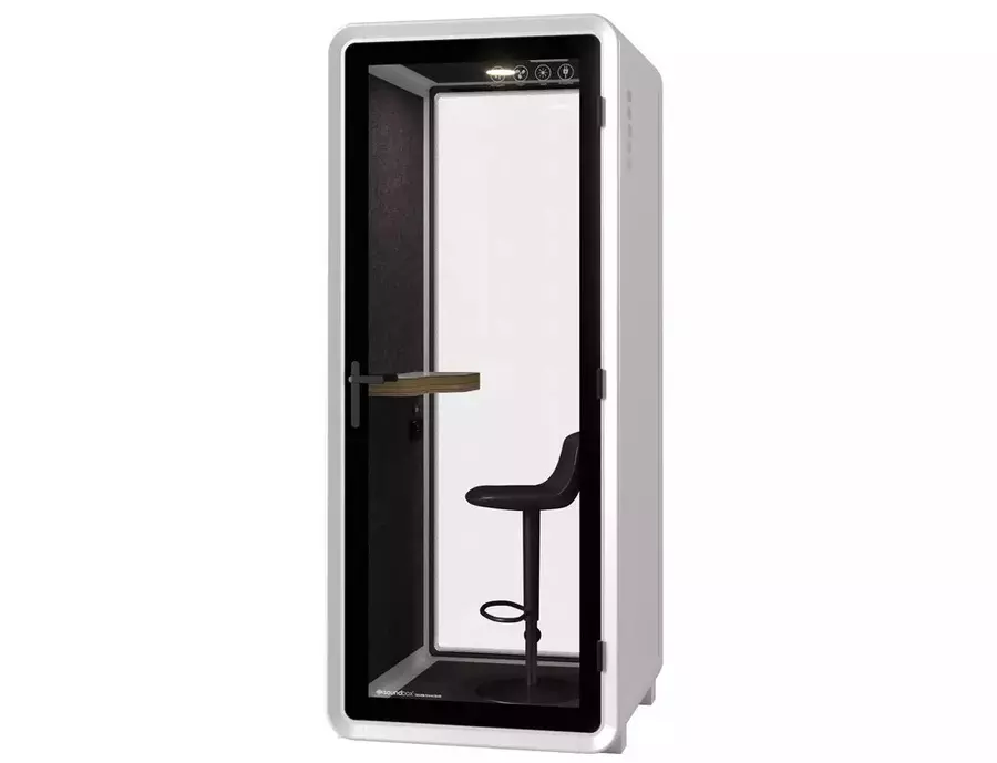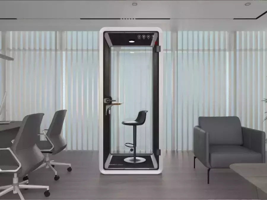 Модерната шумоизолираща акустична кабина е задължителен елемент в съвременните интериори на отворени офис пространства, бизнес сгради, летища и хотели. Тя осигурява удобна и спокойна среда за телефонни разговори или видеоконференции, като позволява на потребителя да се фокусира върху разговора, без да смущава околните. Стъклените врати и задна стена придават на кабината изключително лек и елегантен вид, който се вписва хармонично във всяко модерно пространство.