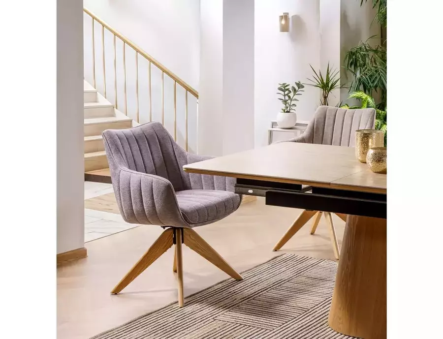 Трапезният стол АЗАЛИЯ D съчетава комфорт, практичност и модерен дизайн, превръщайки се в стилен акцент във всяка трапезария. Конструкцията му е стабилна, с крака, изработени от масивно дърво, които придават естествена топлина и устойчивост. Столът е снабден с въртящ се механизъм до 180 градуса, както и с функция за автоматично връщане в изходна позиция – удобство, което прави използването му още по-лесно и приятно. Седалката и облегалката са тапицирани в мека и приятна на допир дамаска, а вътрешният пълнеж от пяна осигурява оптимален комфорт дори при продължително седене. АЗАЛИЯ D е отличен избор за всеки, който търси съчетание от елегантност и функционалност.