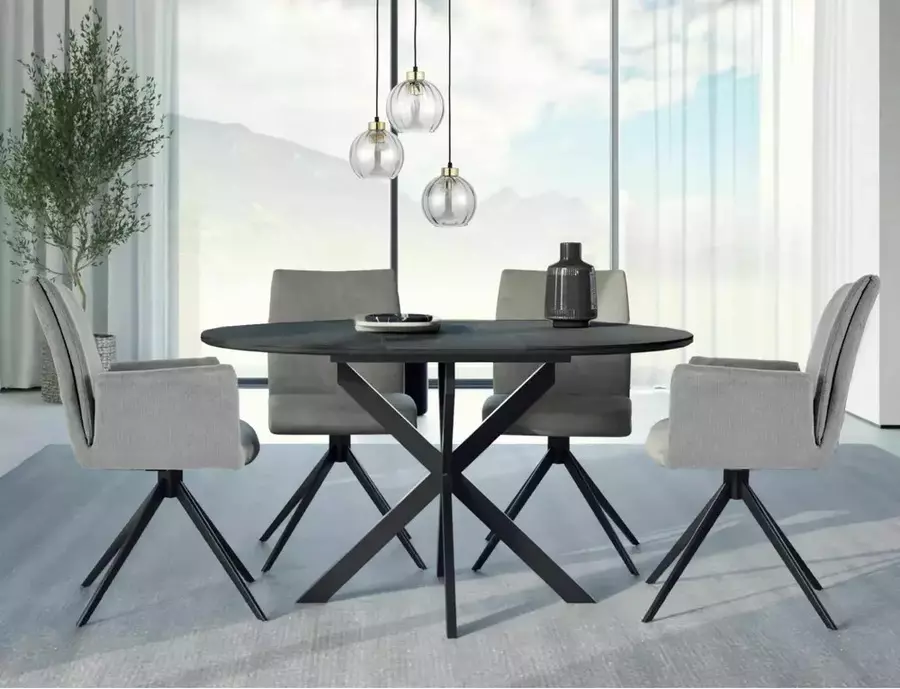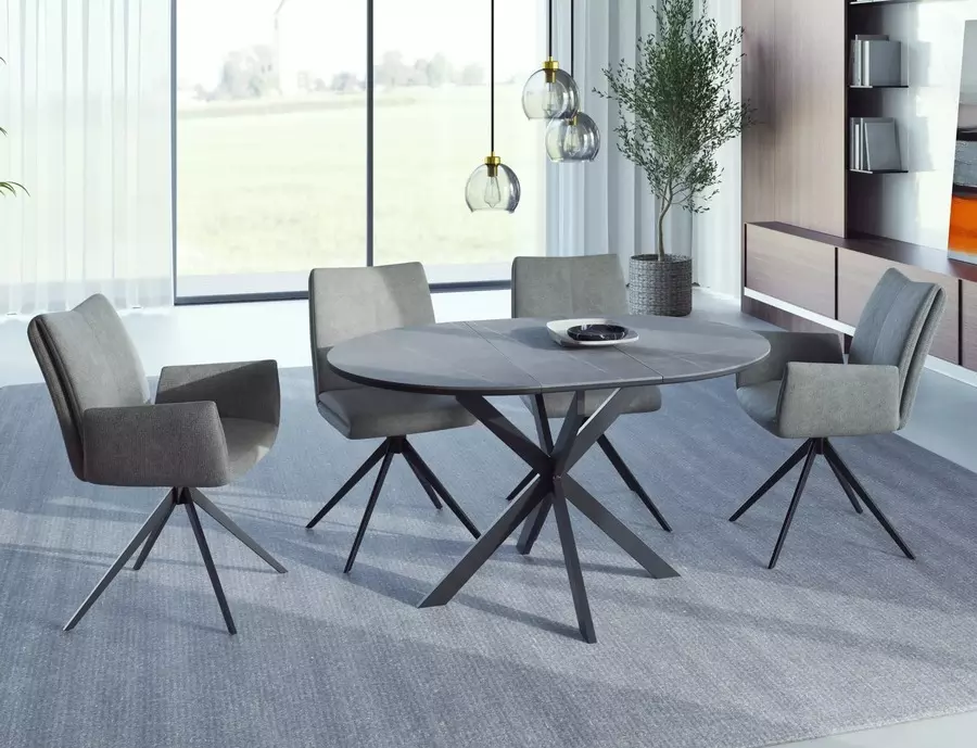 Трапезна маса ГАСТОН впечатлява с модерен дизайн, компактна форма и практична функционалност, съчетавайки стил и удобство в едно. В събрано положение масата е с диаметър 100 см, а благодарение на вградения разтегателен механизъм, тя лесно се увеличава до 135 см, осигурявайки повече пространство за гости и семейни събирания.