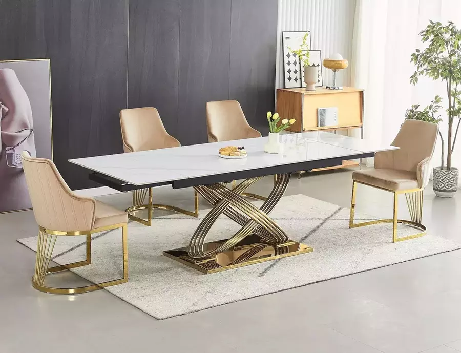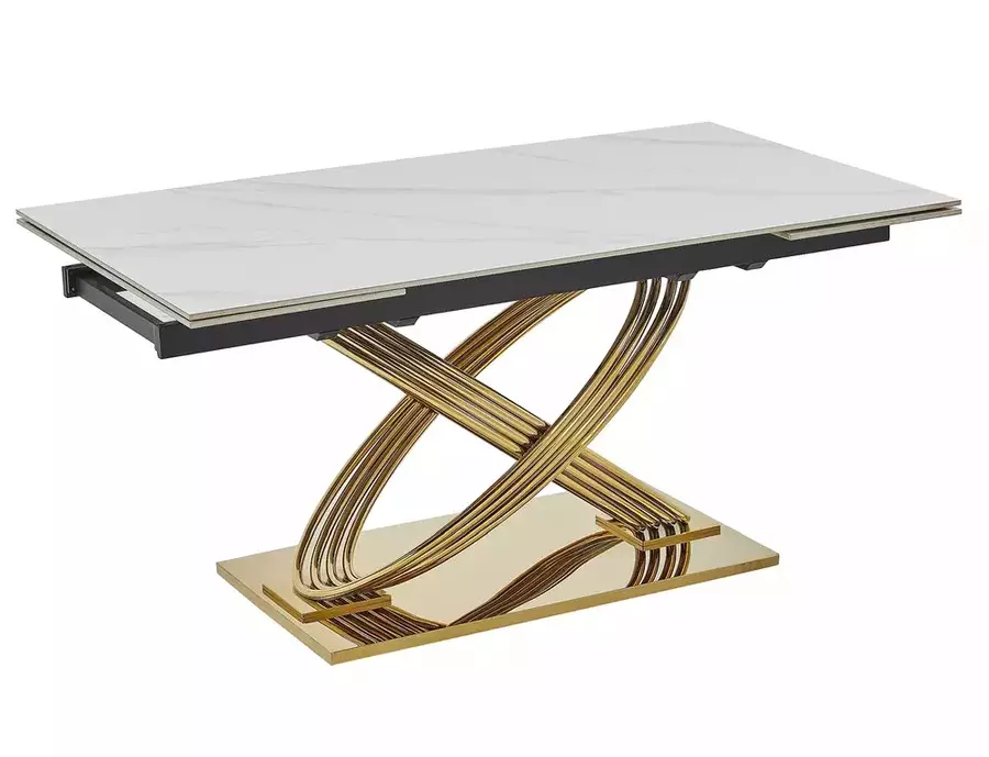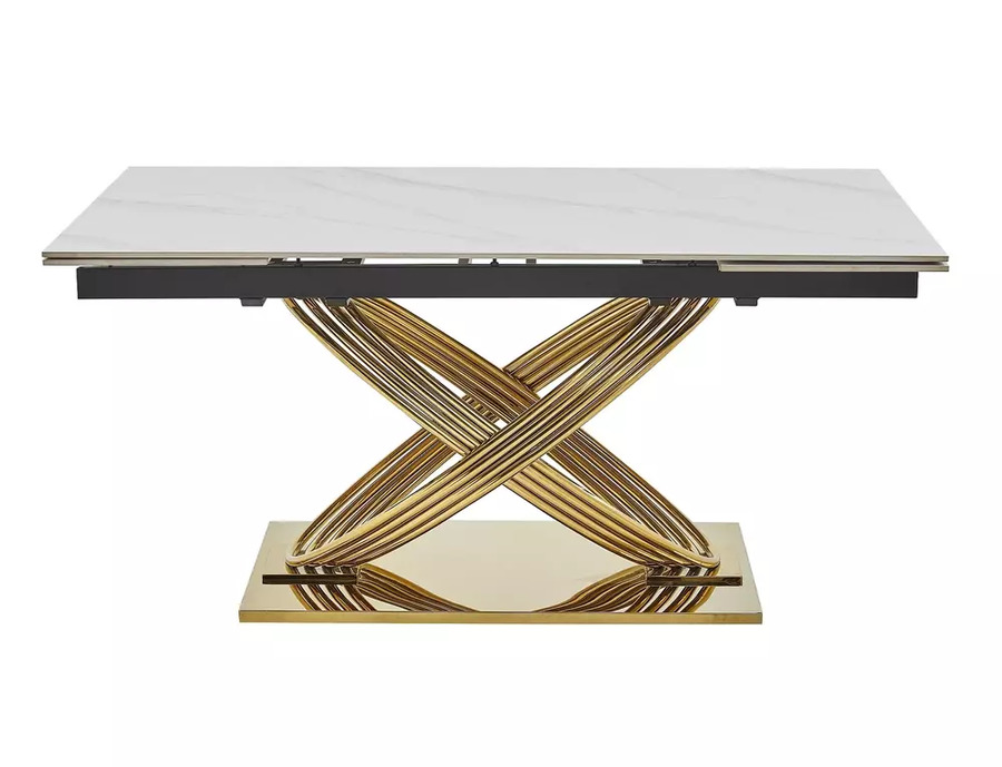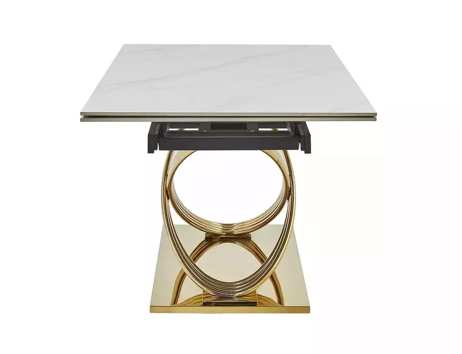Плотът е изработен от висококачествена керамика, устойчива на надраскване, топлина и влага, което я прави изключително практична за ежедневна употреба. Масата е изградена върху здрава метална конструкция, а ефектната основа в златен цвят придава усещане за лукс и изтънченост. ХЕРМЕС съчетава естетика и стабилност в един впечатляващ и функционален дизайн, който ще се открои във всяка трапезария.