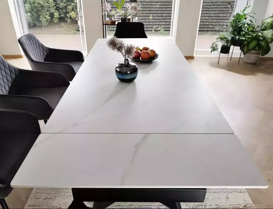 Трапезна маса ЛАКОНИ е впечатляващ модел, който съчетава модерна визия, висококачествени материали и практичност за големи събирания. В събрано състояние масата е с дължина 160 см, но благодарение на два индивидуални разтегателни плота, разположени от двата края, лесно се удължава до 240 см. Това я прави отличен избор за семейни вечери, празници или посрещане на гости, като осигурява място за до 12 човека.