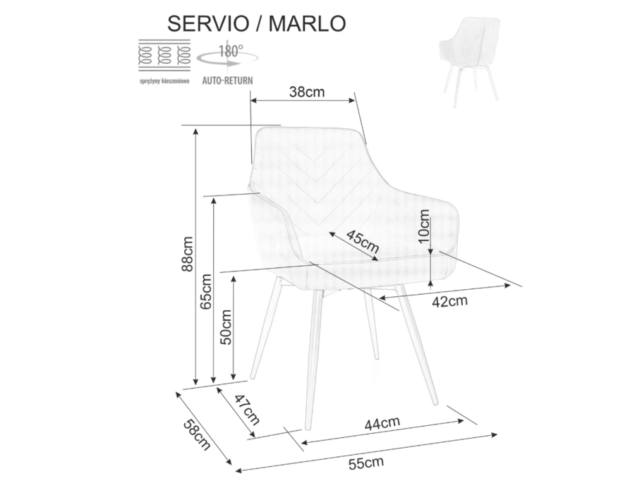 Тапицерията е изработена от здрав текстил, устойчив на износване и лесен за поддръжка – перфектен за интензивна ежедневна употреба. Металната основа гарантира стабилност, а въртящият механизъм до 180 градуса с функция за автоматично прибиране в изходна позиция допринася за още по-голямо удобство и функционалност. СЕРВИО е стилен и надежден избор за модерната трапезария.