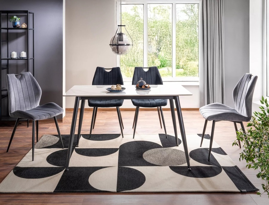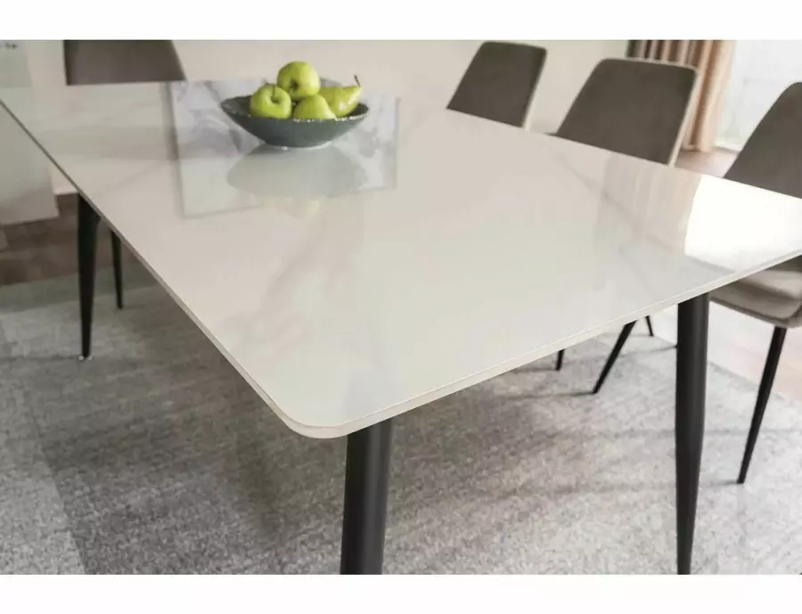 Трапезна маса РИОН е изискано предложение за модерни интериори, в което се съчетават стил, устойчивост и функционалност. Със своя елегантен керамичен плот с мраморен ефект, масата придава усещане за лукс и фин завършек на трапезарията или кухненската зона.