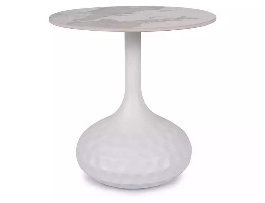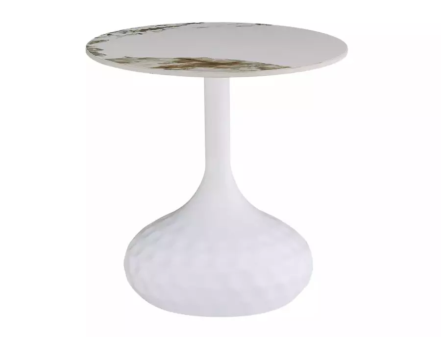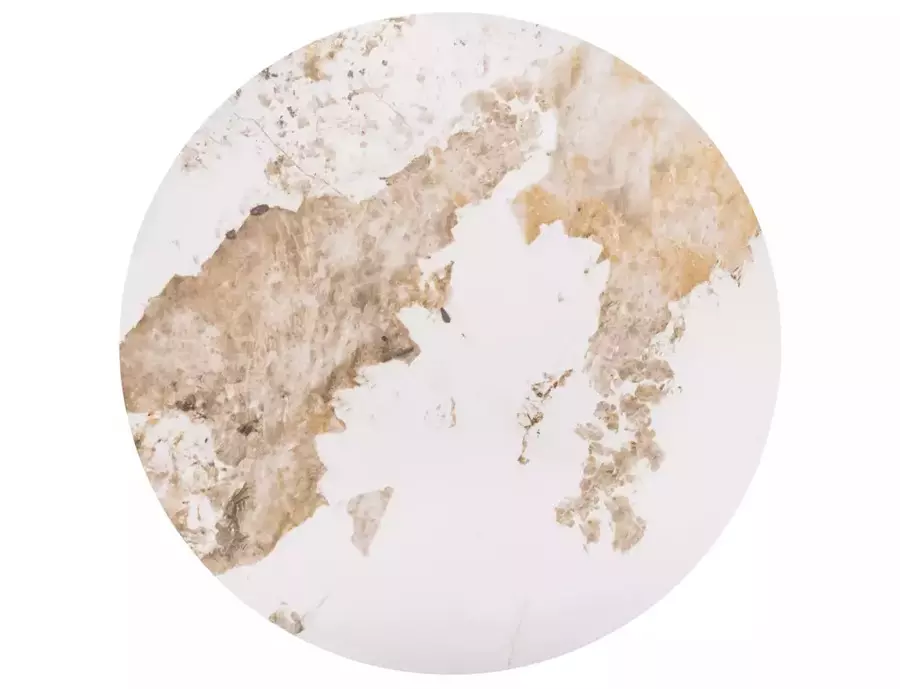 Холна маса САЛО В е стилно интериорно допълнение, което впечатлява с елегантност и съвременно излъчване. Кръглият ѝ плот е изработен от висококачествена керамика с мраморен ефект – текстурата наподобява естествен камък, създавайки усещане за лукс и изтънченост, съчетани с лесна поддръжка и устойчивост на ежедневна употреба.
