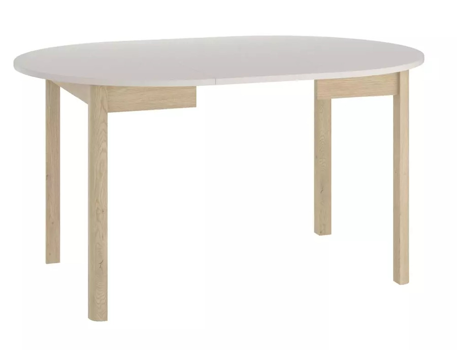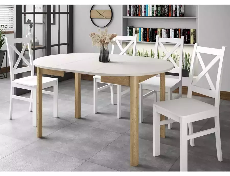 Трапезна маса ДАНТЕ е стилна и практична маса, която съчетава функционалност и естетика. Кръглата ѝ форма с диаметър 102 см е идеална за компактни пространства, а разтегателният механизъм позволява удължаване до 144 см – отлично решение за посрещане на гости. Плотът е изработен от ПДЧ в нежен цвят кашмир, а стабилните крака в дървесен нюанс Дъб Кремона Торо придават усещане за топлина и устойчивост.