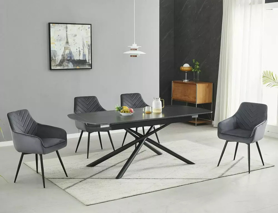 Трапезна маса ВЕКТОР съчетава съвременен стил, функционалност и издръжливост в едно завършено решение за модерния дом. Плотът е изработен от керамика в матово черен цвят – устойчив на топлина, надраскване и лесен за поддръжка. Масивната метална конструкция осигурява стабилност и дълъг експлоатационен живот. Благодарение на вградения разтегателен механизъм, масата се удължава от 160 до 200 см, което я прави подходяща за ежедневна употреба и за събирания с повече гости. Елегантните форми допълват модерния ѝ облик и я превръщат във впечатляващ акцент в интериора.