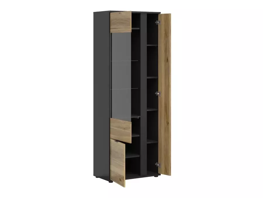 Витрина ЛУЕН REG1W2D/70 от колекция ЛУЕН е стилно и практично допълнение към интериора, което предлага едновременно елегантност и функционалност. Съчетанието от остъклена врата и две плътни врати осигурява идеален баланс между открито и скрито съхранение – подходяща е за подредба на книги, декорации, сервизи и други вещи.