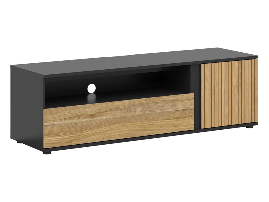 ТВ шкаф ЛУЕН RTV1D1S от колекция ЛУЕН съчетава модерна визия и функционалност, като осигурява удобно и стилно място за вашата телевизия и мултимедийни устройства. Моделът разполага с едно чекмедже и една врата, които предлагат практично пространство за съхранение на дистанционни, кабели, аксесоари и други вещи, които искате да бъдат подредени и извън погледа.