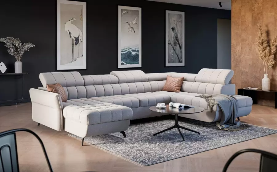 Ъглов диван ЕЛАРИАС U II е впечатляващо предложение за просторни дневни, в което стилният дизайн среща комфорта и многофункционалността. Със своя П-образен силует и две лежанки, моделът предлага обширна зона за сядане, отдих и социални моменти у дома. Едната от лежанките е с оформено гръбче, което позволява допълнително място за удобно настаняване, без да се нарушава хармонията на интериора.