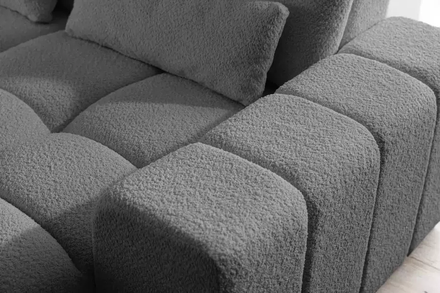 Тапициран в мек и устойчив текстил тип букле, който е приятен на допир и лесен за поддръжка, диванът впечатлява със своя уютен характер и модерна естетика. Моделът се предлага и в други видове дамаски и цветове – за да получите повече информация и да изберете най-подходящия текстил, е необходимо да се свържете с наш консултант.