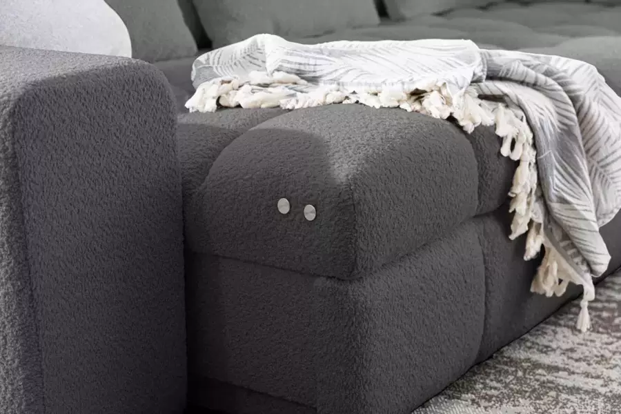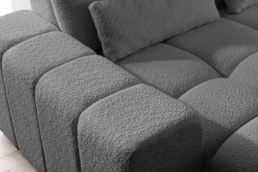 Тапициран в мек и устойчив текстил тип букле, който е приятен на допир и лесен за поддръжка, диванът впечатлява със своя уютен характер и модерна естетика. Моделът се предлага и в други видове дамаски и цветове – за да получите повече информация и да изберете най-подходящия текстил, е необходимо да се свържете с наш консултант.