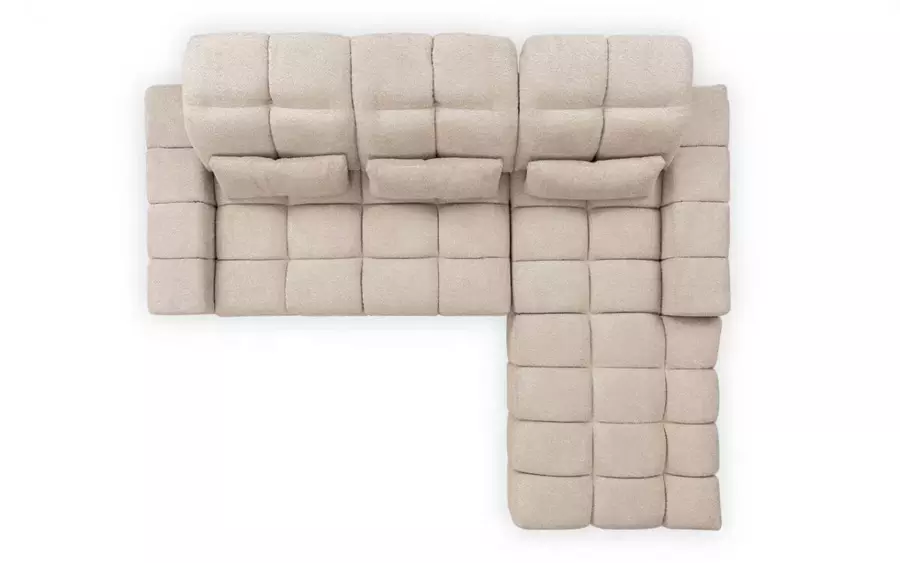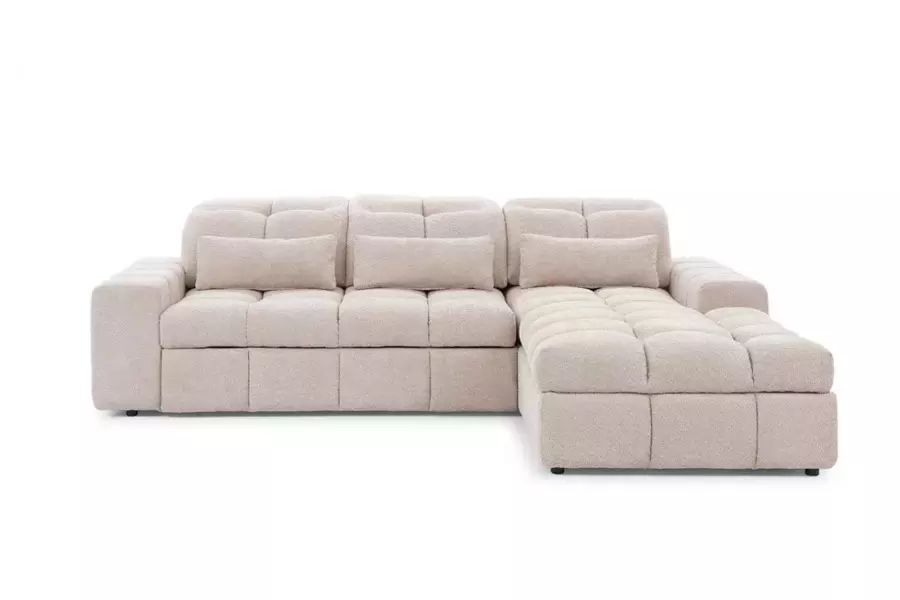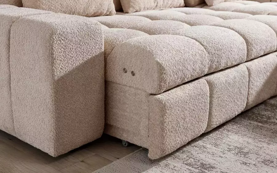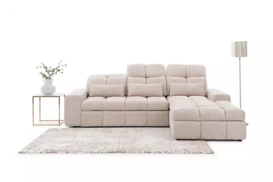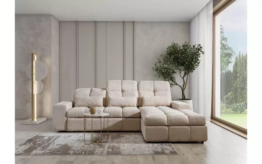 Тапициран в мек и устойчив на износване текстил тип букле, който е лесен за почистване и придава топъл, уютен облик на интериора. За клиентите, които желаят различна визия, моделът се предлага и в други текстили и цветове – необходимо е да се свържете с наш консултант, който ще ви представи наличните възможности.