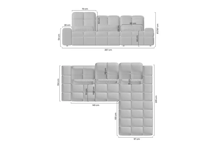 Седалката е изработена от високоеластична пяна и зиг-заг пружини, което гарантира комфортна поддръжка и издръжливост дори при ежедневно използване. Облегалките са с пяна с плътност T25, която осигурява балансирана мекота и подкрепа. Подглавниците са с регулируеми механизми, позволяващи адаптация спрямо предпочитанията на всеки потребител.