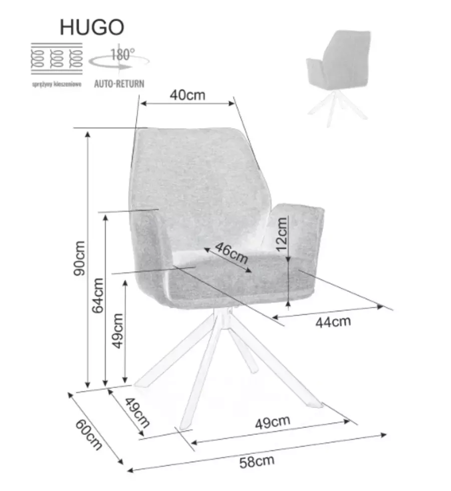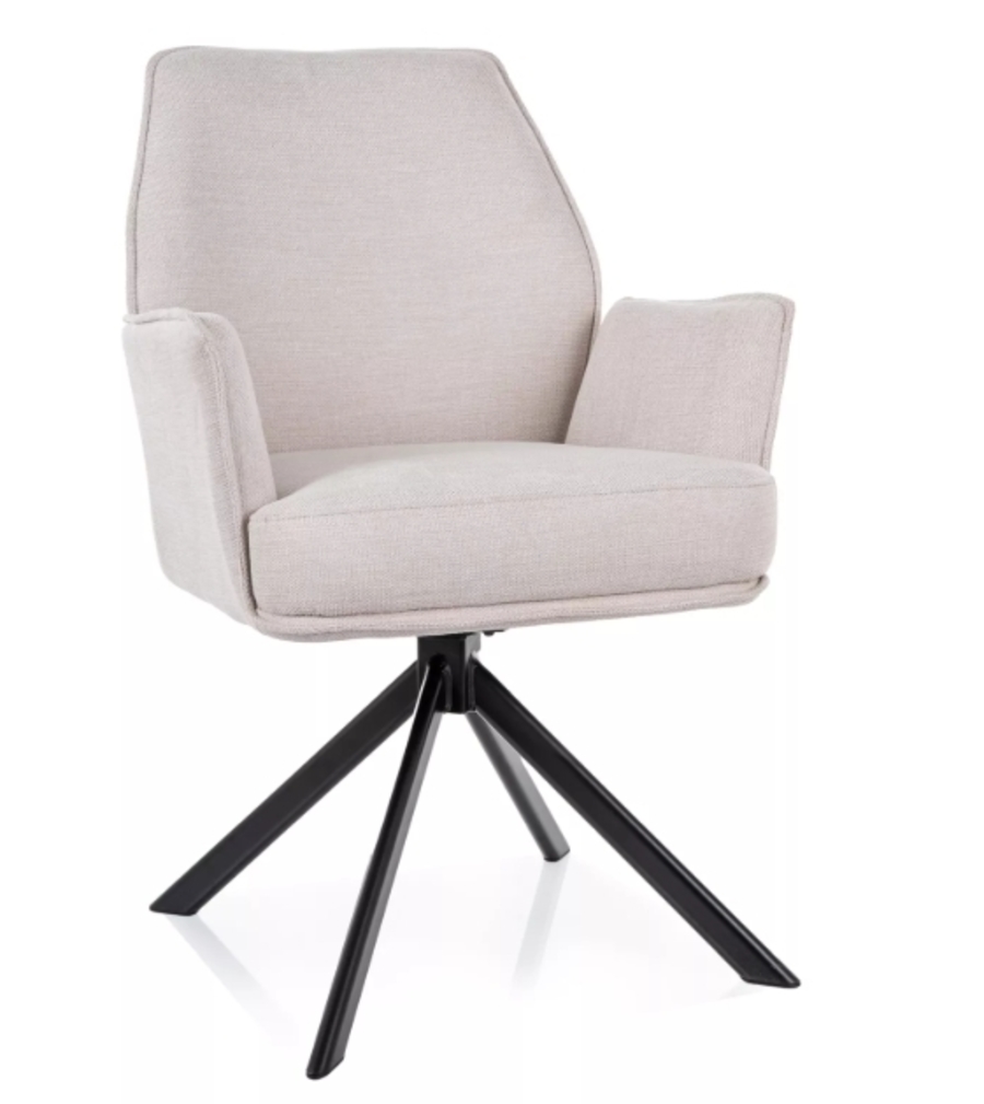 Кресло ХЮГО е перфектен избор за всеки модерен интериор. Изработено от плътна пяна и устойчива на износване висококачествена материя, креслото осигурява дълготраен комфорт. Металните крака с матово покритие добавят стабилност и стил. Със седалка, която се завърта на 180 градуса, и максимално натоварване до 120 кг, креслото съчетава удобство и практичност. Подходящо за трапезарии, дневни, офиси и съвременни пространства, то комбинира елегантен дизайн с висока функционалност.