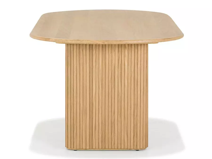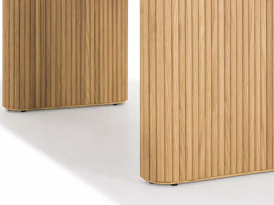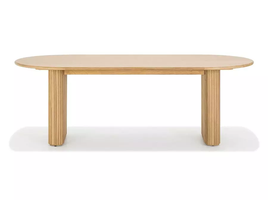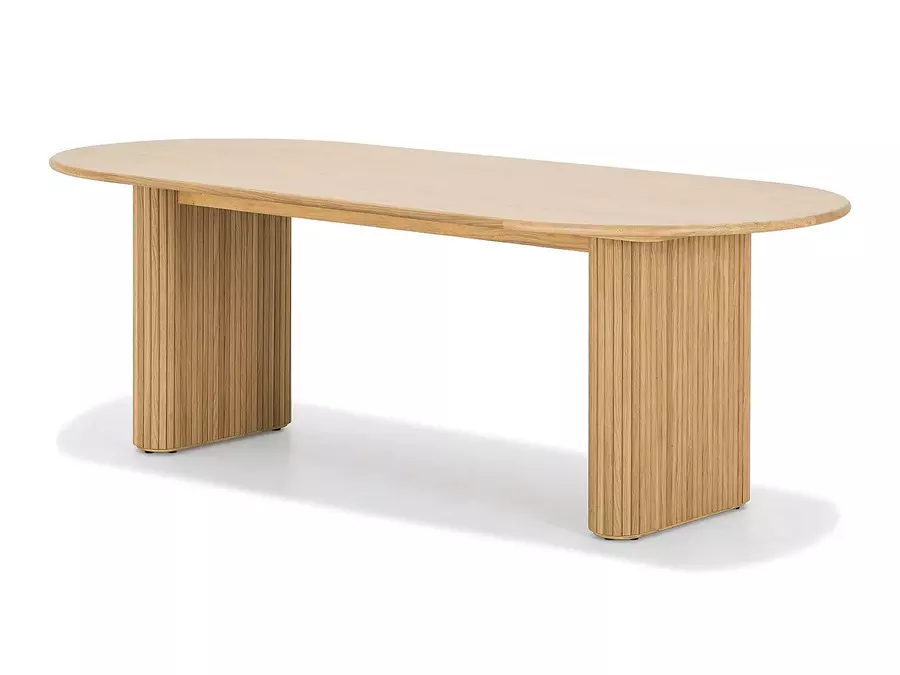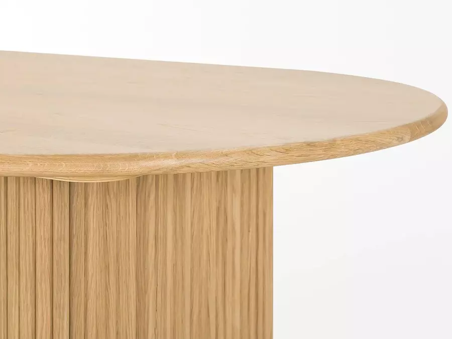 Плотът е с елегантна овална форма, която придава мекота на визията и осигурява удобство за сядане от всички страни. Овалната линия прави масата визуално лека и подходяща както за просторни, така и за по-компактни трапезарии. Ефектните крака са нейн акцент — с дизайнерско оформление, стабилна конструкция и прецизна изработка. Те съчетават естетика и функционалност, като създават стабилна основа и отличителен характер.