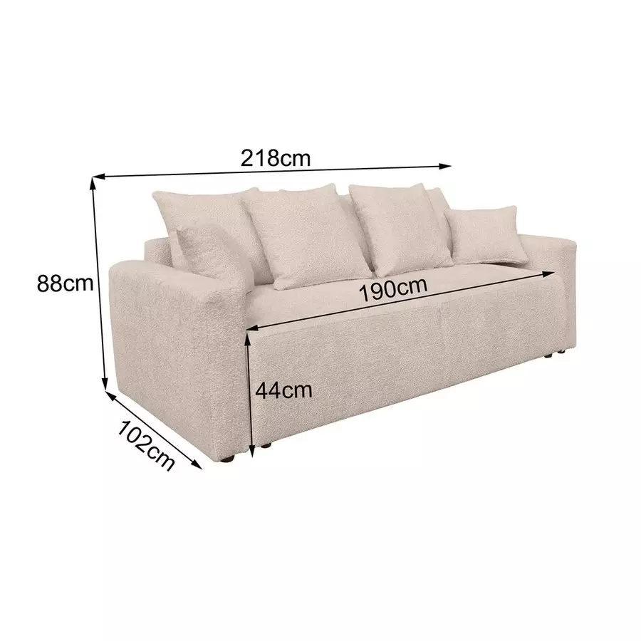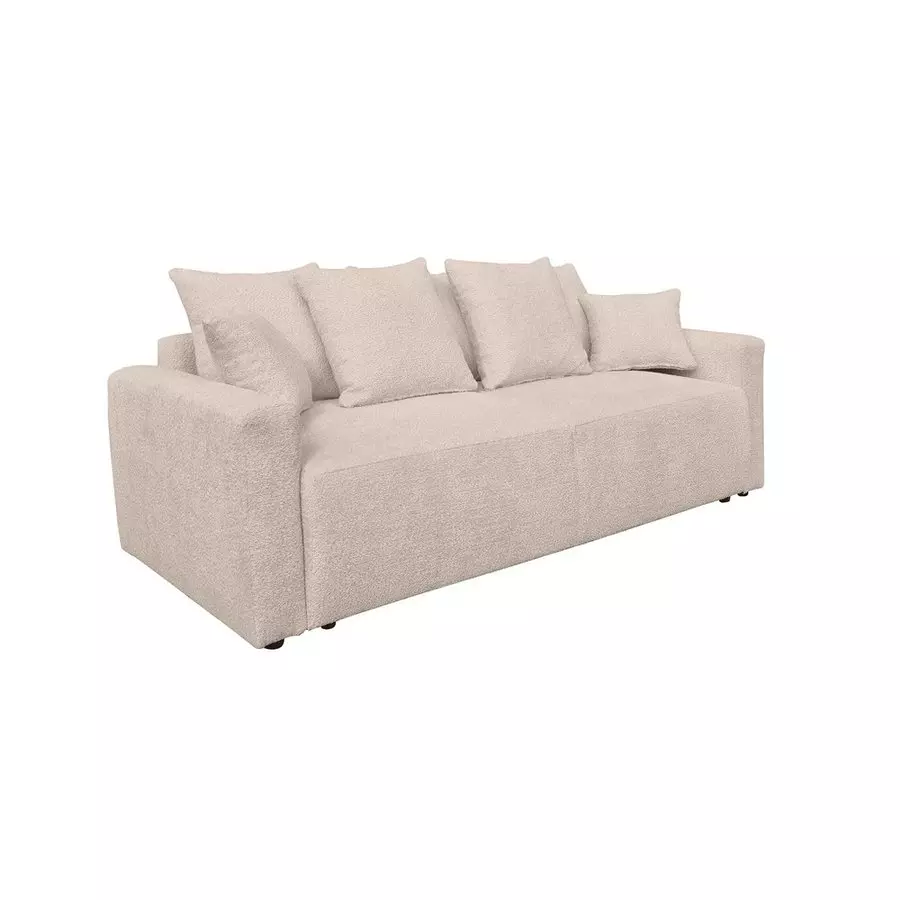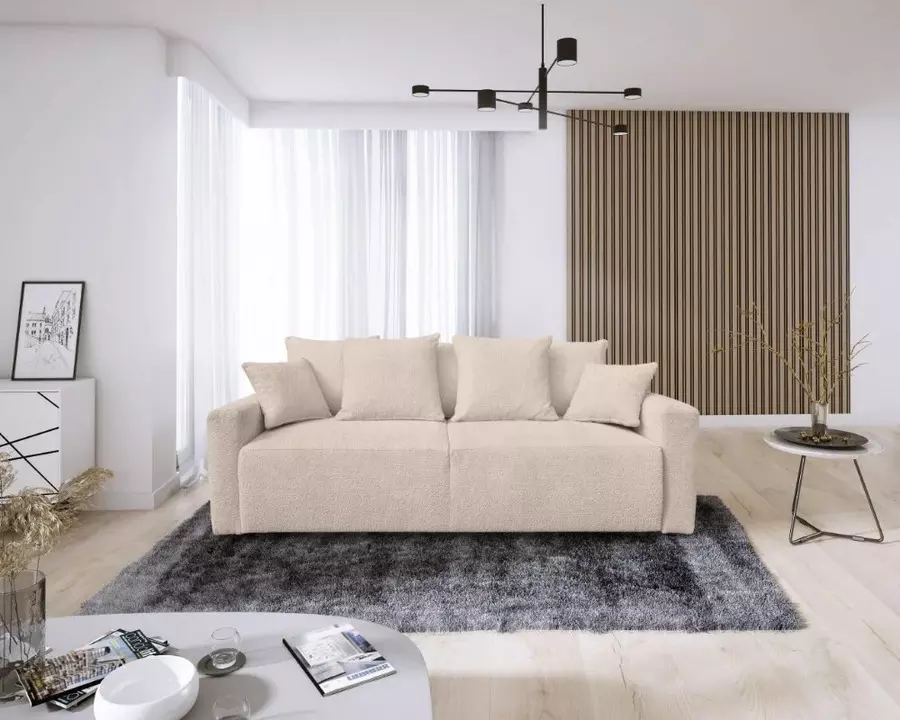 Моделът разполага с ракла, осигуряваща допълнително място за съхранение на спално бельо или други вещи, което го прави още по-практичен за ежедневна употреба. Тапициран е в букле текстил – модерен, мек на допир, издръжлив и лесен за поддръжка материал, който придава на дивана ефектен и уютен вид.