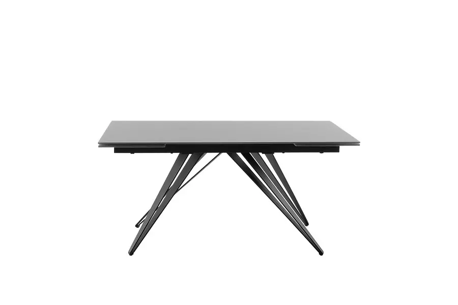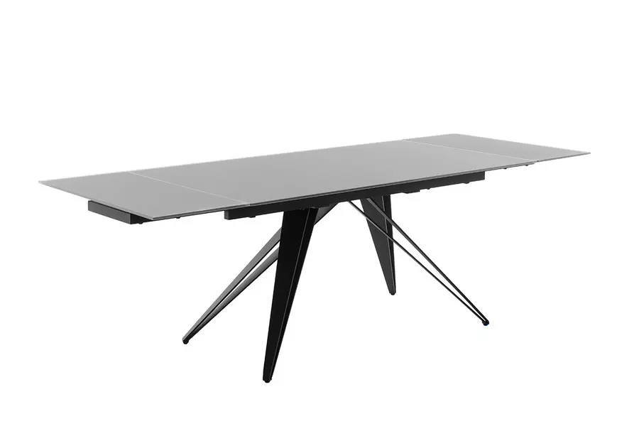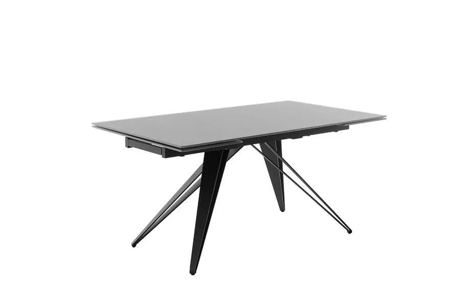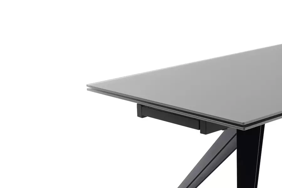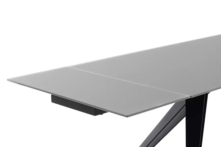 Плотът на масата е изработен от висококачествено закалено матово стъкло, което освен че изглежда елегантно, е и устойчиво на надраскване и топлина. Солидната метална конструкция осигурява изключителна стабилност и здравина, като същевременно подчертава модерния и изчистен вид на мебелта.