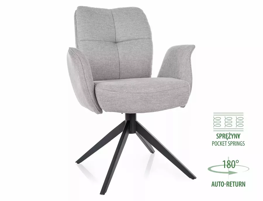 Кресло Линк е идеално допълнение към всяко съвременно пространство. Тапицирано с висококачествена текстилна материя, то предлага изключителен комфорт и стил. Ергономичната седалка и подлакътници осигуряват удобство при дълготрайно седене. Металната основа в черно матово покритие е стабилна и здрава, като разполага с 180-градусов въртящ се механизъм с функция за автоматично връщане. Тази характеристика прави креслото подходящо както за трапезарии и дневни, така и за офиси.