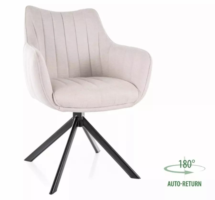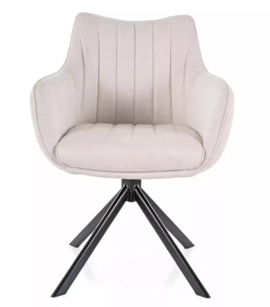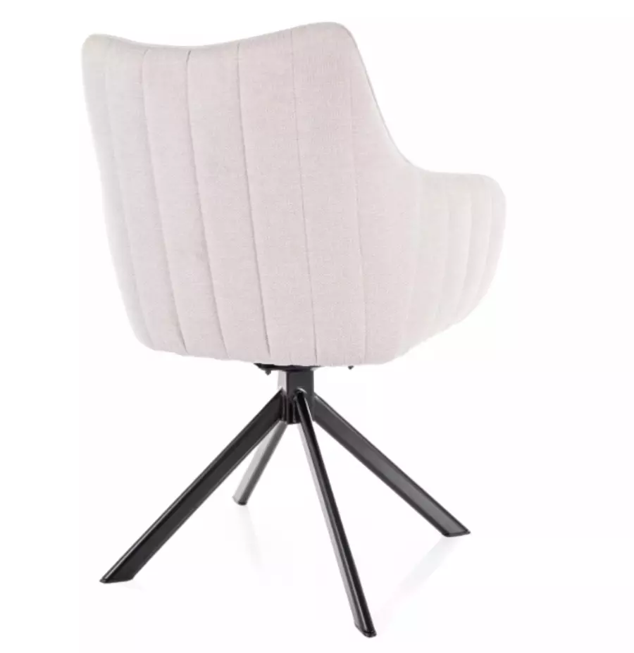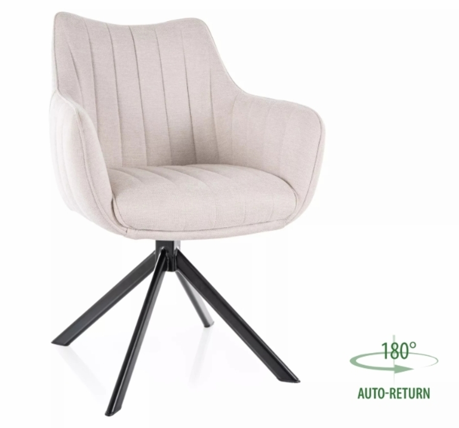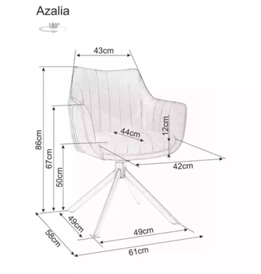 Кресло АЗАЛИЯ е елегантно и функционално решение за всяка всекидневна или трапезария. С тапицирана седалка и механизъм за въртене на 180 градуса, креслото автоматично се връща в изходна позиция след завъртане, благодарение на специалния механизъм. Изработено е върху здрава метална основа с черно матово покритие, което осигурява стабилност и дълготрайност. Това кресло съчетава стилен дизайн и висока издръжливост, като е подходящо за модерни интериори.