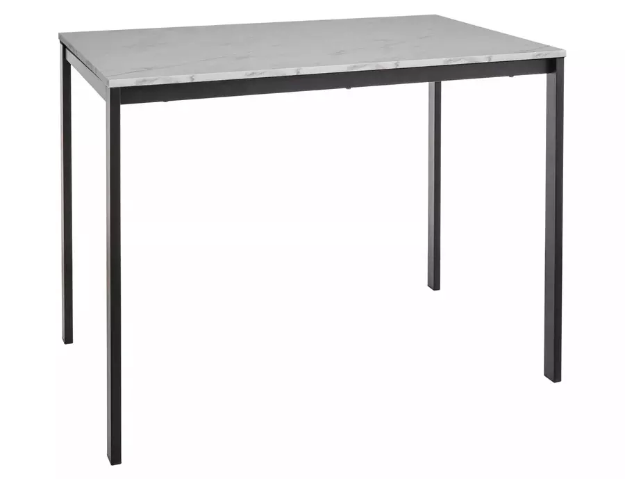 Плотът е изработен от ПДЧ и е покрит с фолио в мраморен ефект. Това придава лек декоративен акцент, като същевременно повърхността е лесна за почистване и поддръжка. Масата е подходяща за ежедневна употреба и предлага необходимата практичност без излишни елементи.