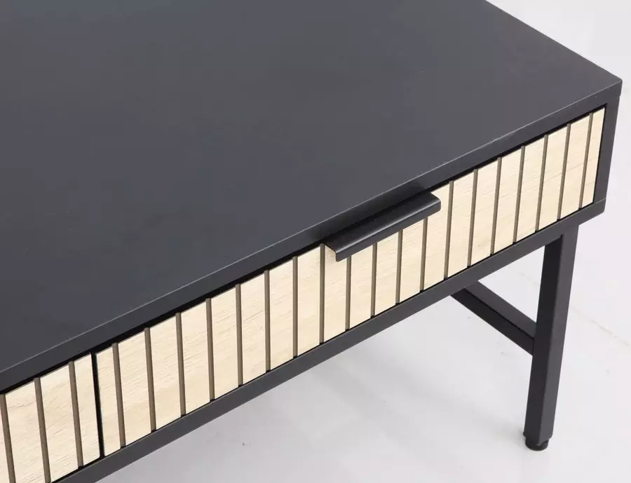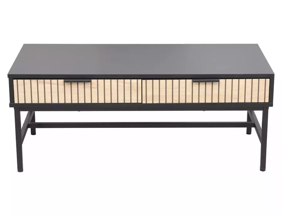 Краката са метални, което придава на масата допълнителна стабилност и съвременен индустриален облик. Двете вградени чекмеджета осигуряват практично място за съхранение на дистанционни, списания, аксесоари или други малки вещи, запазвайки реда във всекидневната.