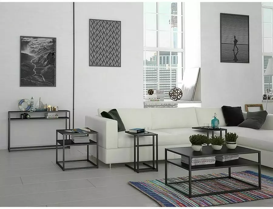 Помощна маса СИМФОНИЯ С е елегантна и стилна мебел, която придава модерен характер на всяко помещение. Основната структура е изработена от метални крака с прахово покритие в черен цвят, които осигуряват здрава носеща конструкция и устойчивост на натоварване. Плотът е от ПДЧ, също в черен цвят, с гладка повърхност, лесна за почистване и поддръжка. Ъглите са леко закръглени, за да се избегне травматизъм и да се добави естетика. Помощна маса СИМФОНИЯ С е с компактни размери, които я правят подходяща за поставяне до диван, кресло или в кът за кафе. Универсален дизайн, който се комбинира добре както със съвременен интериор, така и с по-класически мебели.