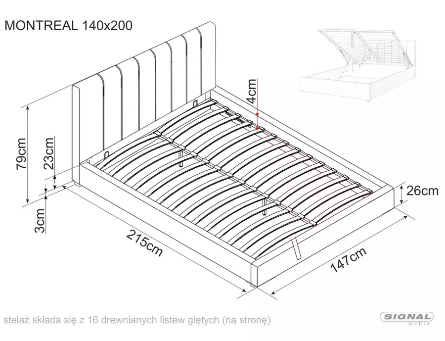 Леглото разполага с включена в цената подматрачна рамка, както и с вграден механизъм за повдигане, който осигурява лесен и удобен достъп до просторната ракла, разположена под матрака. Това допълнително пространство е изключително практично за съхранение на спално бельо, завивки, дрехи и други вещи, което прави легло МОНТРЕАЛ идеално решение за по-малки жилища или за хора, търсещи ефективна организация в спалнята.
