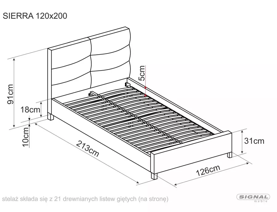 Легло СИЕРРА е стилно и практично решение за обзавеждане на спалня, младежка или гостна стая. Моделът е предназначен за двулицев матрак с размер 120х200 см и е отличен избор за тези, които търсят баланс между комфорт, елегантност и функционалност. Конструкцията на леглото е повдигната на крачета, което позволява лесно почистване под него и подобрява вентилацията в зоната на сън.