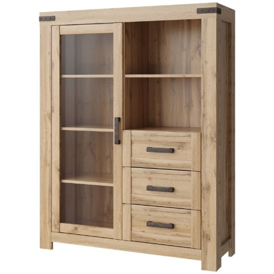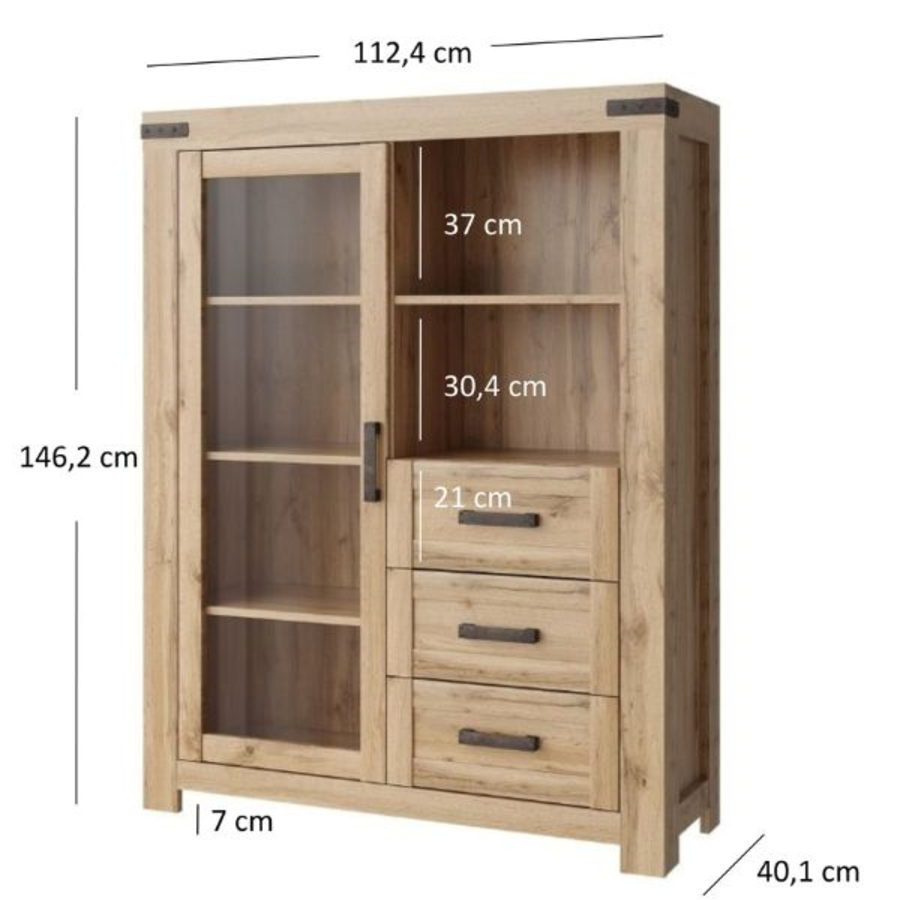 Моделът разполага с една стилна вратичка със стъкло, която придава визуална лекота и позволява излагане на любимите декорации или сервизи. От едната страна на витрината се намира открит рафт, подходящ за бърз достъп до книги, аксесоари или акцентни предмети. Трите чекмеджета в долната част осигуряват допълнително пространство за организиране на вещите в дома, като същевременно допринасят за подреден и хармоничен вид на помещението.