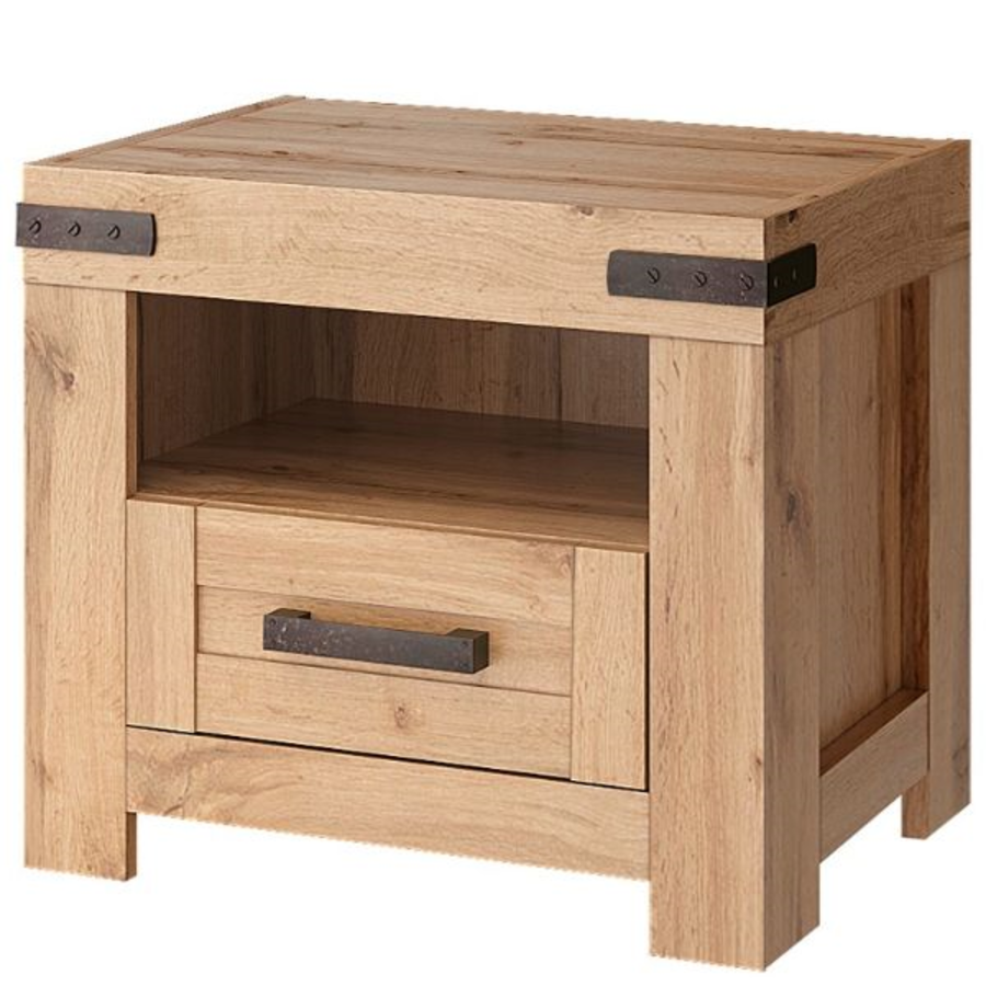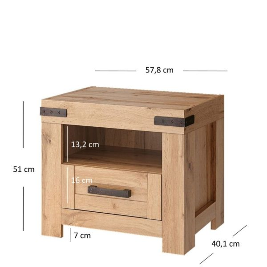 Шкафчето разполага с едно чекмедже, което предлага удобно място за съхранение на лични вещи, книги или аксесоари, като поддържа подреден вид на пространството около леглото. Горната му повърхност е идеална за поставяне на нощна лампа, чаша вода или декорация. Компактните му размери го правят подходящо както за големи, така и за по-малки спални помещения.
