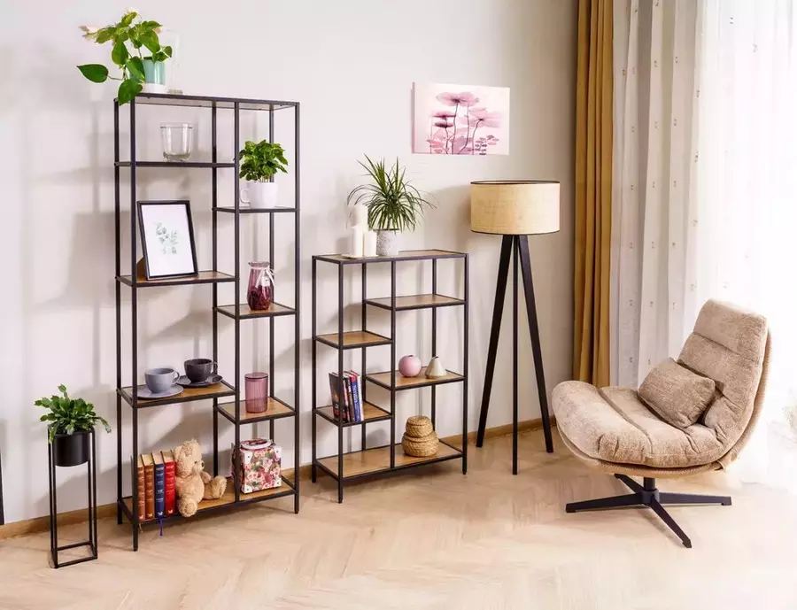 Тази етажерка предоставя удобно място за подреждане на книги, декоративни предмети, аксесоари или кутии за съхранение, като същевременно внася усещане за ред и стил. Комбинацията от метал и ПДЧ придава модерен индустриален облик, който се вписва чудесно в различни интериорни стилове – от минималистични до класически.