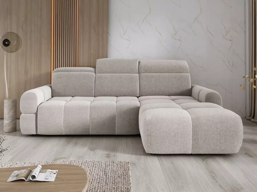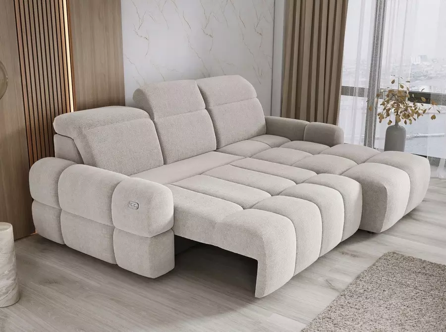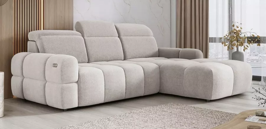 Ъглов диван MATEO S е модерно и практично решение за всеки интериор, съчетаващо елегантен дизайн и функционалност. Той е оборудван с електрически механизъм за регулиране на дълбочината на седалката, който позволява лесно адаптиране според нуждите и дори може да бъде използван като функция сън – идеално решение за гости или за ежедневен релакс.
