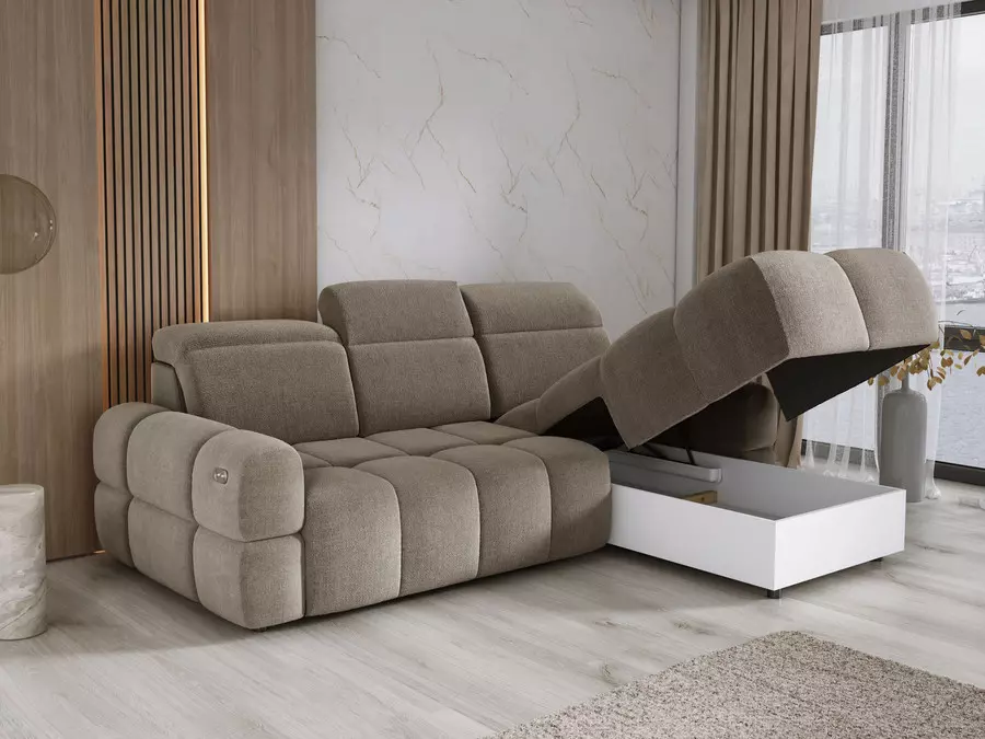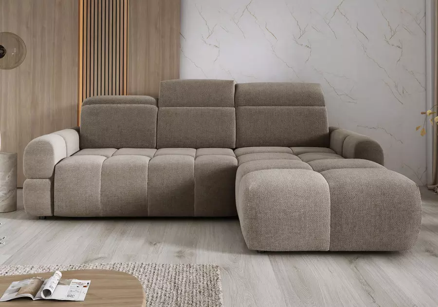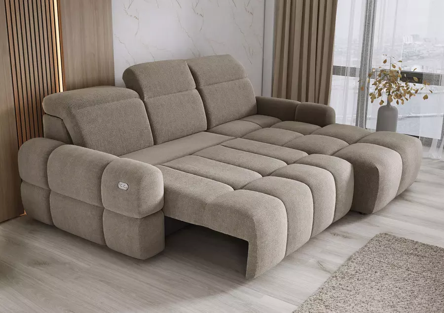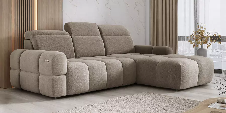 Ъглов диван MATEO S е модерно и практично решение за всеки интериор, съчетаващо елегантен дизайн и функционалност. Той е оборудван с електрически механизъм за регулиране на дълбочината на седалката, който позволява лесно адаптиране според нуждите и дори може да бъде използван като функция сън – идеално решение за гости или за ежедневен релакс.