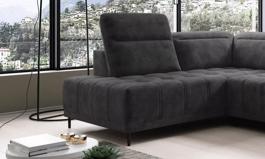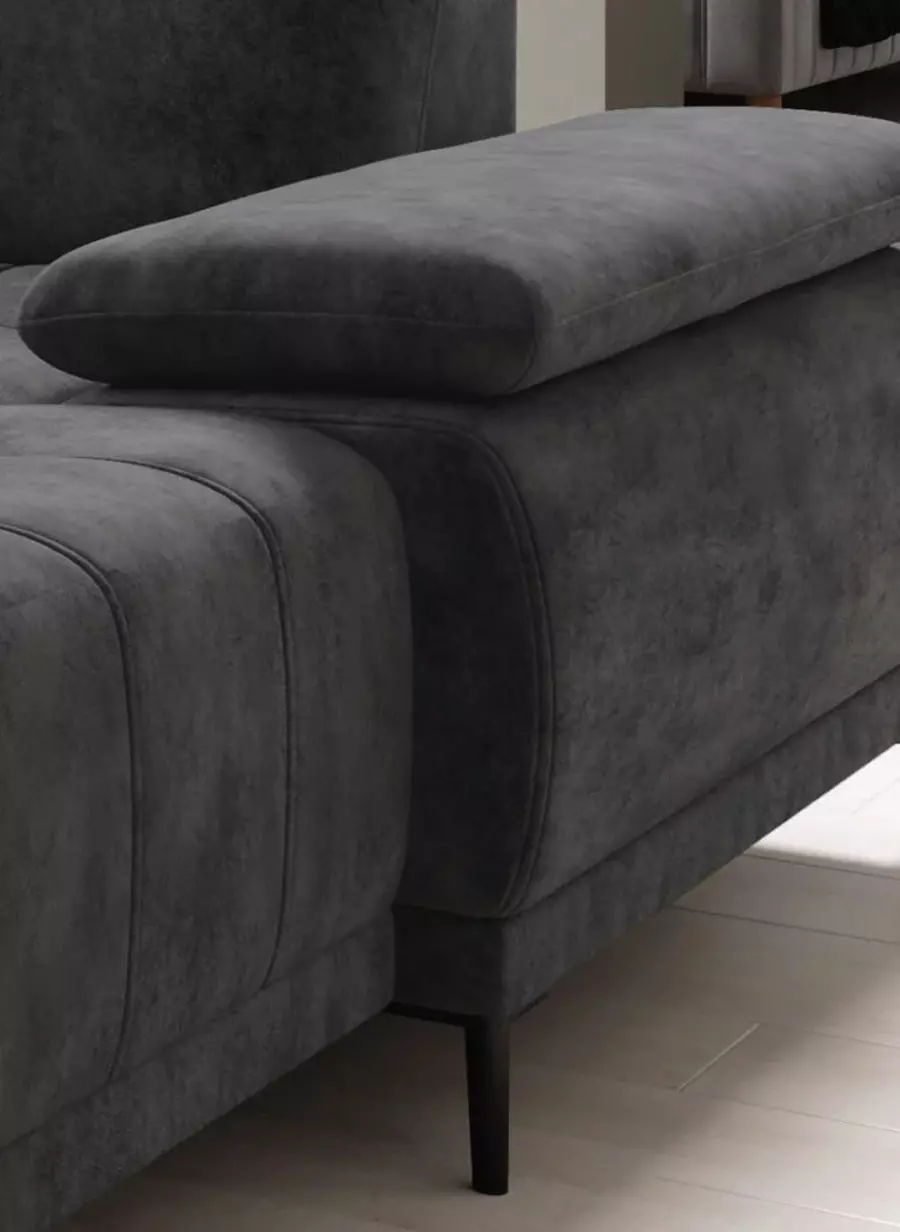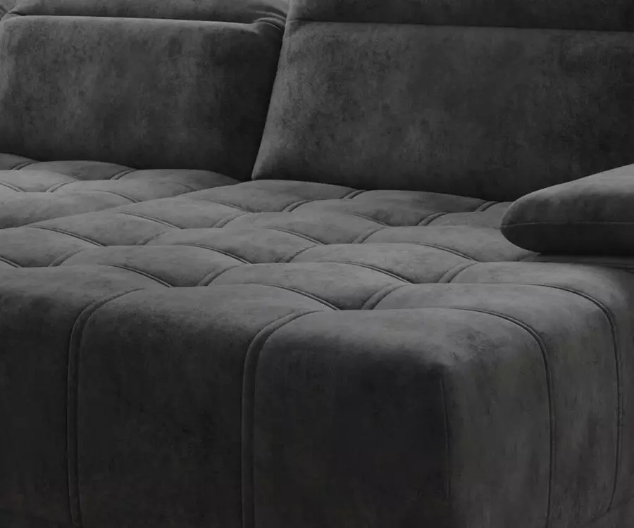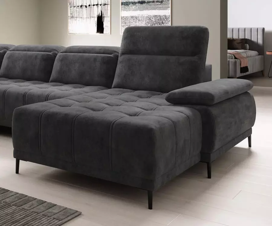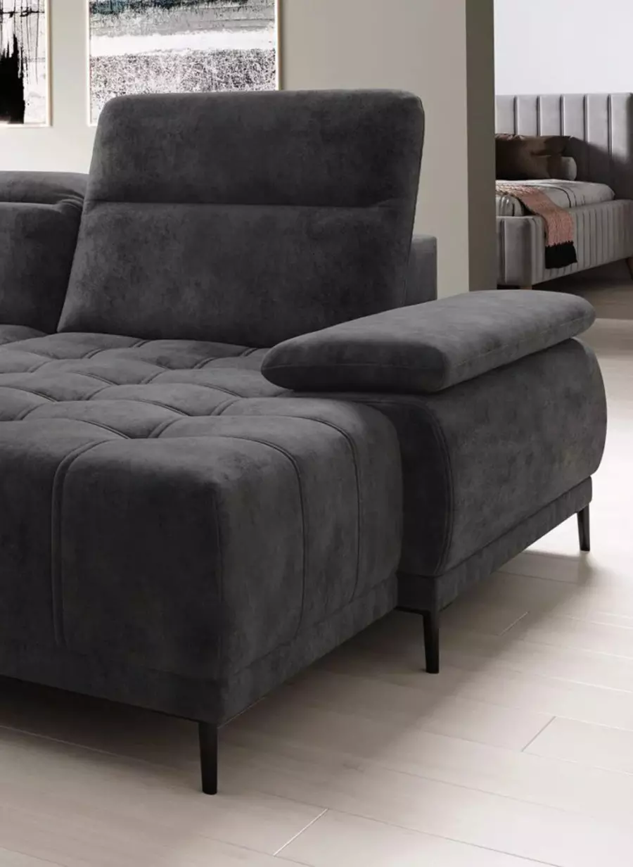 Електрическият механизъм за регулиране на дълбочината на седалката позволява увеличаване с до 27 см, като тази функция се трансформира и в практична възможност за сън. Това превръща ъглов диван ФОКУС XL в удобно и стилно място както за почивка през деня, така и за нощен сън при необходимост.