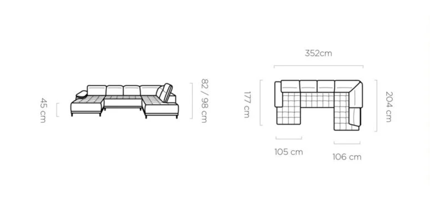 Ъглов диван ФОКУС XL предлага изискан дизайн и впечатляваща функционалност, съчетани с практичност и усещане за уют. Въпреки своята П-образна форма, моделът се отличава с компактни размери, които го правят подходящ дори за по-ограничени пространства, без да прави компромис с усещането за простор и комфорт.