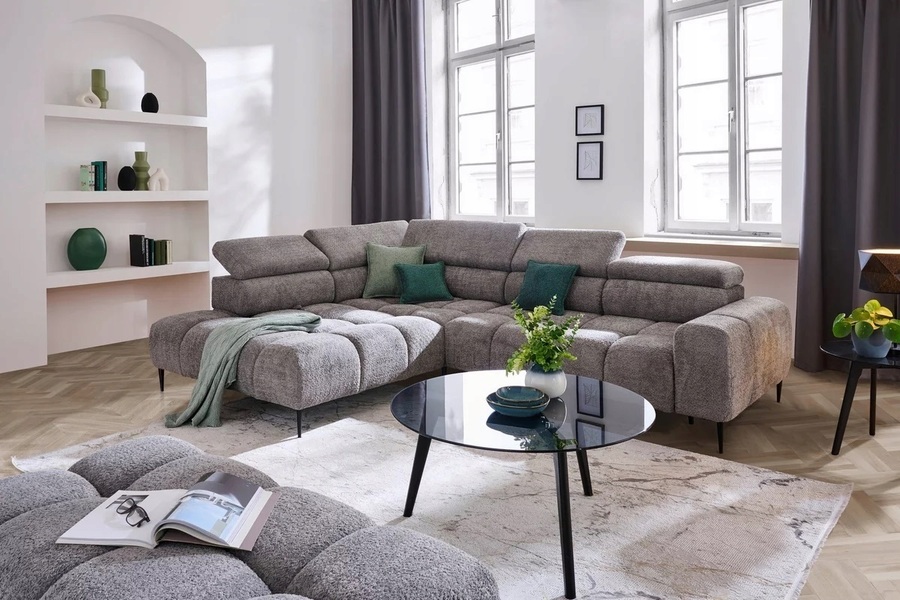 Ъглов диван ПЛАЗА L е стилно и функционално решение за всеки модерен дом, което съчетава комфорт, изчистен дизайн и технологични удобства. Със своята елегантна форма, моделът се вписва отлично както в по-малки, така и в просторни дневни помещения.